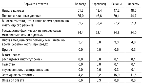 Более половины жителей Вологодской области считают, что наиболее существенным препятствием росту численности населения являются низкие доходы (49 %). Не менее значимый фактор представляют и плохие жилищные условия – это мнение особенно распространено среди жителей Вологды и Череповца (55 и 47 % соответственно). Вариант ответа: «Многие считают, что в наше время достаточно иметь одного ребенка» был поддержан 31 % жителей региона. Четверть населения (24 %) утверждает, что «государство фактически не поддерживает материально семьи с детьми». Высказывались также мнения, что распадается институт семьи, что росту численности населения мешают пьянство, неуверенность в завтрашнем дне.