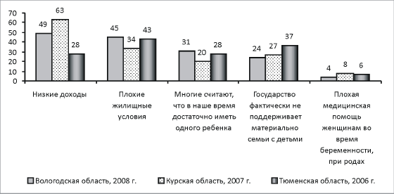 Рис. 2.1. Распределение ответов на вопрос: «Что, по Вашему мнению, мешает росту численности населения в нашем регионе?» – в Вологодской (2008 г.), Курской (2007 г.) и Тюменской (2006 г.) областях, в % [19, 21, 22, 23, 24]