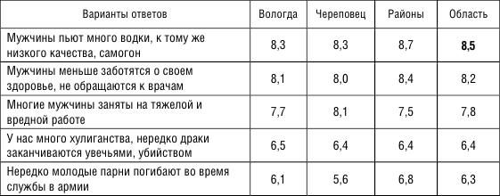 Жители Вологодской области, оценивая причины низкой продолжительности жизни у мужчин, самую высокую оценку – 8,5 балла из 10-ти возможных – дали такому варианту ответа: «Мужчины пьют много водки, к тому же низкого качества». Причем в районах оценки данной причины еще выше – 8,7 балла. (табл. 2.2).