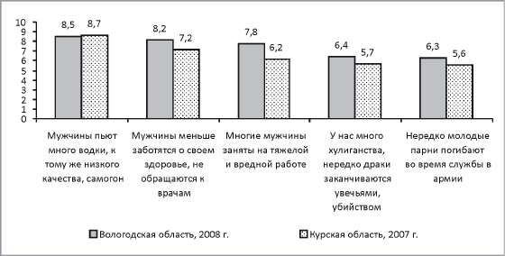 Рис. 2.2. Причины низкой продолжительности жизни мужского населения в Вологодской и Курской областях (по данным опроса, в баллах)