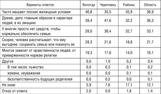 Основными причинами снижения брачности и повышения разводимости население Вологодской области называет, во-первых, плохие жилищные условия (37 %). Во-вторых, оно разделяет мнение: «Думаю, дело главным образом в характере людей, в их эмоциях» (36 %). «У многих просто нет средств, чтобы нормально обеспечить семью» – так считает 33 % населения (табл. 2.3).