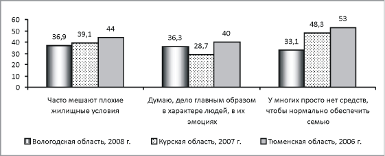 Рис. 2.3. Распределение ответов на вопрос: «Что, по Вашему мнению, сегодня мешает созданию семьи или ведет к ее разрушению?» – в Вологодской (2008 г.), Курской и Тюменской (2006 г.) областях, в %