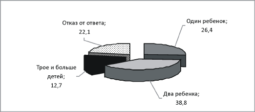 Как правило, более 40 % молодых родителей (24–34 года) растят одного ребенка; 60 % людей более старшего возраста (40–44 года) имеют двоих детей. Троих и больше детей имеют люди старше 60 лет (32 %), то есть их дети стали уже вполне взрослыми, а доля семей, имеющих трех и более несовершеннолетних детей, не превышает 6 %.