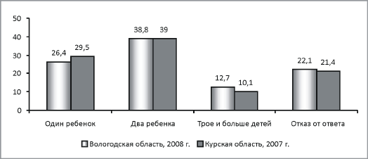 Согласно данным опроса жители Вологодской области (39 %) в основном имеют двоих детей (рис. 2.4). Одного ребенка в своей семье воспитывает 26 % населения. Троих и более детей – 13 %. В семьях Вологодской и Курской областей мы наблюдаем общие тенденции детности (рис. 2.5).