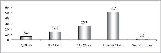 Рис. 2.6. Распределение ответов на вопрос: «Давно ли Вы живете в этом городе (поселке, селе, деревне)?», в %
