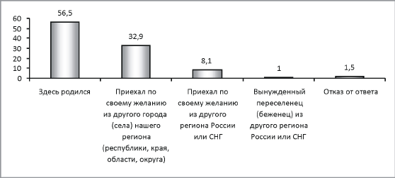 Рис. 2.7. Распределение ответов на вопрос: «Вы здесь родились или приехали из другого города (села), из другого региона?», в %