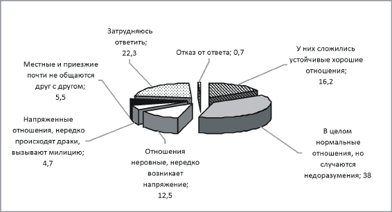 Рис. 2.8. Распределение ответов на вопрос: «Если Вы знаете о жизни приезжих (переселенцев, беженцев и др.) в нашем регионе, поделитесь своими впечатлениями: хорошие ли у них отношения с коренным населением?», в %