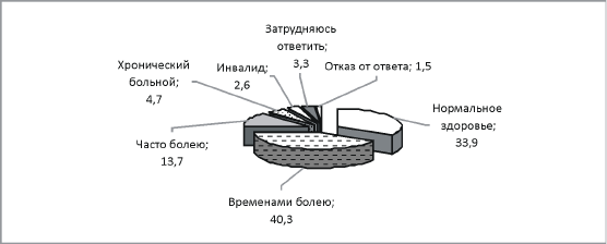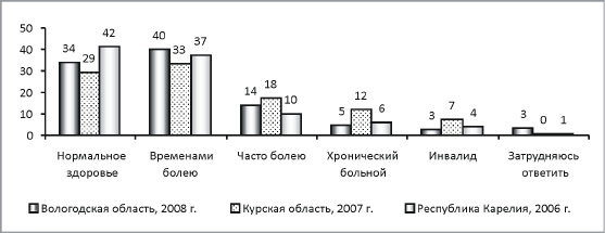 В сравнении с Курской областью и Республикой Карелия Вологодская область обнаруживает срединные значения показателей (рис. 2.10). Однако в Вологодской области несколько больше людей, которые «временами болеют», при этом меньше хронических больных и инвалидов.
