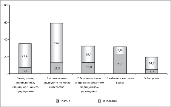 Рис. 2.11. Распределение ответов на вопрос: «Где Вы получали медицинскую помощь в последний раз и платили ли Вы за это?», в %