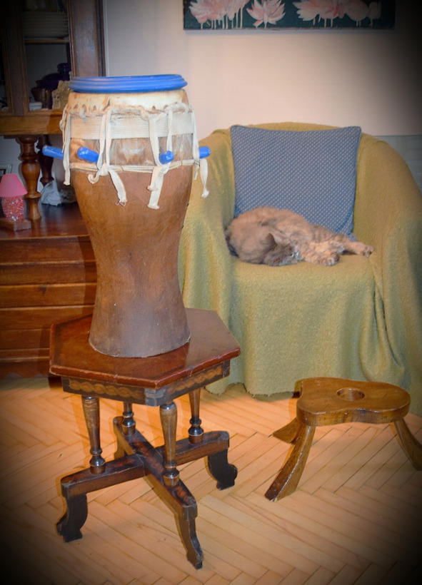 Африканский барабан Там-Там. Кожу на нем я порвал еще в детстве и сейчас там прикреплена синяя токарная тарелка, как подставка, а колки тоже покрашены синим.