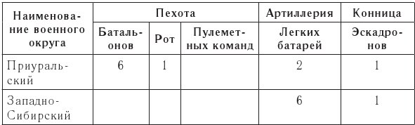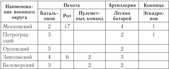 Примечание. Из перечисленных частей 4 стрелковых батальона, 4 стрелковых роты, 6 легких батарей находились в стадии формирования или отправки в войска.