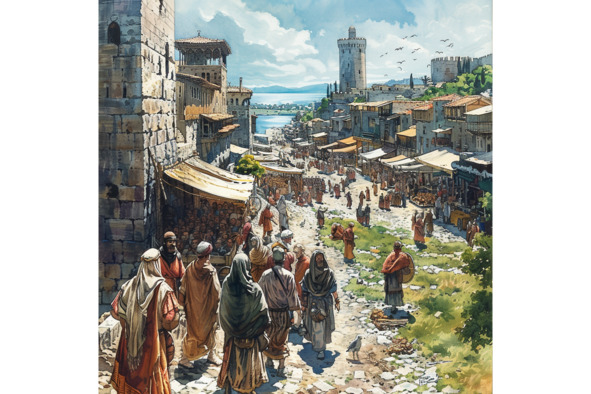 Подле на полотняном стульчике восседал молодой кучерявый рамей. Платком он то и дело вытирал пот, градом катившийся со лба от палящих лучей полуденного солнца, и с тоской поглядывал на снующий мимо базарный люд. Время от времени юноша оглашал воздух призывными криками: «Раб! Сильный и послушный раб! За смешную цену!»