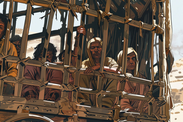 Речь держал кучерявый сосед, расположившийся у противной стенки повозки. Вид у него был измождённый. Вроде и не стар, но явно и не молодец. Шелушащиеся колени выглядывали из рваных портков, тело едва прикрывал кусок заношенной материи. На груди болтался деревянный крестик на верёвочке. Острые ключицы выпирали из-под смуглой кожи. Лицо было узким и сердитым, но большие впалые глаза смотрели по-доброму. Рамей?