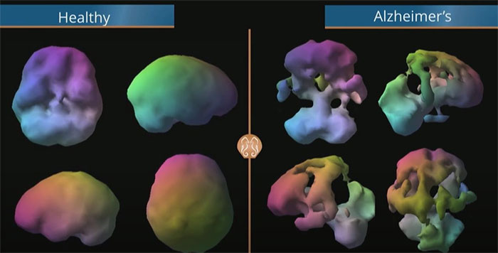 Изображение слева – это проекция здорового мозга. Изображение справа это модель того, как выглядит мозг типичного пациента с болезнью Альцгеймера. При этой болезни задняя половина мозга попросту умирает, и проблема заключается в том, что этот паттерн на самом деле развивается в вашей голове за десятилетия до того, как начинают проявляться какие-либо конкретные симптомы.