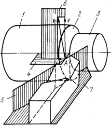 1 и 3 – обрабатываемая и обработанная поверхности; 2 – поверхность резания; 4 и 6 – основная и рабочая плоскости; 5 и 7 – плоскости резания и основания резца