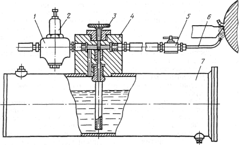 Распыленную жидкость подают с помощью специальной установки (рис. 6.5). Сжатый воздух из цеховой воздушной сети поступает через шланг в редуктор 7, в котором давление воздуха понижается до 0,2–0,45 МПа и поддерживается постоянным в процессе работы. С помощью крана 2 можно прекратить подачу воздуха. Из редуктора сжатый воздух направляется одновременно в инжектор 4 и верхнюю часть бачка 7 с эмульсией. Под действием давления воздуха она поднимается по трубке в инжектор, где распыляется, и далее по шлангу через стопорный кран 5 и сопло 6 подается в зону резания со стороны задней поверхности инструмента.