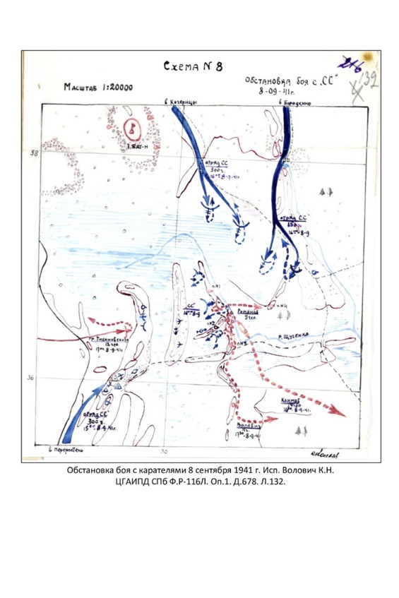 Первый отряд карателей, численностью до 150 солдат действовал от д. Бородкино на юг к смолокурне. В д. Бородкино 8 сентября в результате перестрелки убиты немецкими карателями 4 партизана, два попали в плен. Немцами захвачено оружие и радиостанция. Также, согласно немецким документам, 638-й охранный батальон 8 сентября в Бородкино захватил в плен двух партизан. Они были расстреляны 10 сентября6969