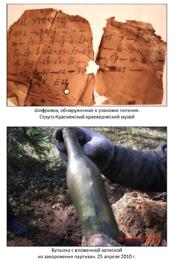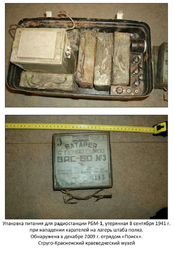 В декабре 2009 г. поисковик и краевед Александр Дмитриевич Сергеев узнал у старожила деревни Полоски Михаила Степановича Иванова о месте расположения партизанского лагеря, существовавшего в 1941 г. После обследования места осыпавшихся землянок в глухой чаще леса в земле был обнаружен большой металлический ящик, в котором лежали батареи для радиостанции. На батареях стояла дата их выпуска – 1 июля 1941 г. Рядом лежала полуистлевшая шифровка, цифры переведены в текст, можно разобрать: «Николаево Милютино мотоколонны». В настоящее время батареи и шифровка экспонируются в военном зале Струго-Красненского краеведческого музея.