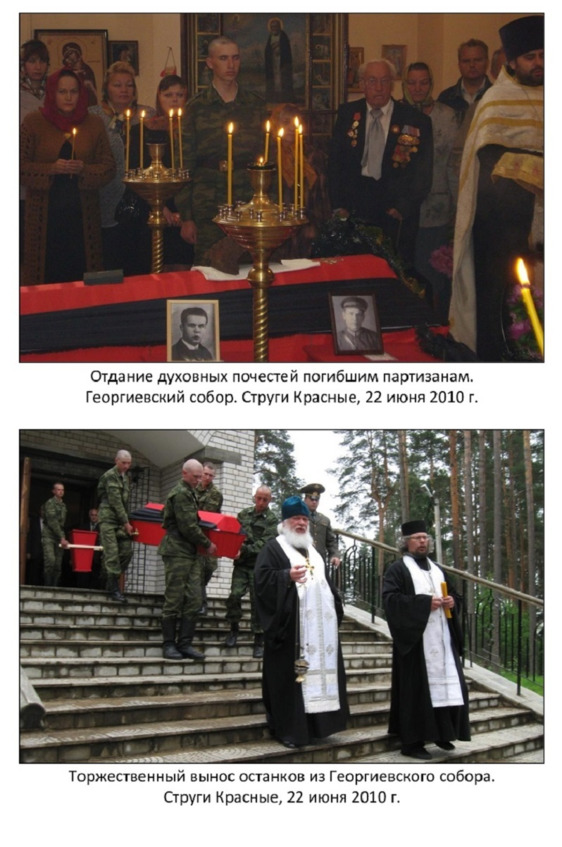 Утром в Георгиевском соборе посёлка Струги Красные прошла божественная литургия и поминовение убиенных воинов, а также торжественная панихида к захоронению останков погибших воинов в Великой Отечественной войне. Службу проводили православные священники: игумен Алексий Масловец, иереи Димитрий Ульянов и Илия Бурдин. Священнослужители сопровождали церемонию перезахоронения вплоть до её завершения.