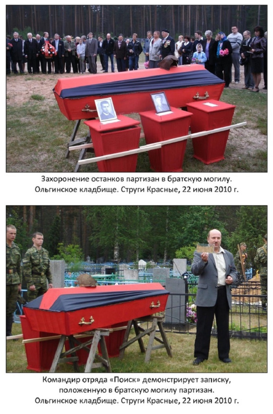 Затем был торжественный вынос останков из Георгиевского собора и препровождение на Ольгинское кладбище посёлка для захоронения на братском участке. Возле братского захоронения на кладбище был открыт митинг. На митинге выступили: Глава Струго-Красненского района Александр Анатольевич Волков, военный комиссар Фёдор Таирович Закиров, командир отряда «Поиск» Андрей Иванович Фёдоров и др. На митинге присутствовали многочисленные местные жители, депутат Государственной Думы М. П. Иванов, представители политических партий и молодёжных движений района, а также гости из Пскова и Санкт-Петербурга. Звучали слова благодарности за мирное небо тем, кто пожертвовал своими жизнями.