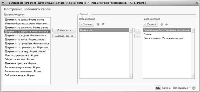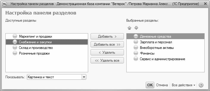 В данном окне определяется содержимое панели разделов. Например, если вы не намерены использовать в своей работе раздел Зарплата и персонал или Розничные продажи – вы можете убрать ссылки на них из панели действий.