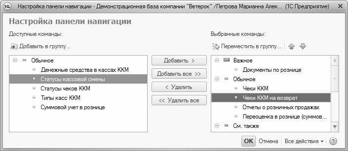 Панель навигации настраивается для каждого раздела в отдельности, потому что в разных разделах содержимое данной панели отличается. Например, в разделе Розничные продажи панель навигации содержит ссылки для перехода к работе с кассами ККМ в режим формирования чеков (настройка именно этой панели навигации показана на рис. 1.9).