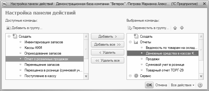 По умолчанию все команды уже распределены по группам Создать, Отчеты и Сервис. Однако вы можете команду, которая по умолчанию входит в одну группу, поместить в другую (например, вместо группы Отчеты включить ее в группу Сервис и т. д.), а также перемещать уже включенные в состав панели действий команды из группы в группу – это делается по тем же правилам, что и в режиме настройки панели навигации (подробнее см. предыдущий урок).