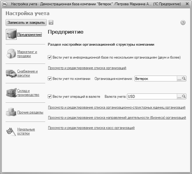 Сущность данной настройки заключается в том, чтобы определить концептуальную направленность учета, реализуемого с помощью конфигурации. Например, здесь вы указываете валюту управленческого учета, выбираете организацию, от имени которой будет эксплуатироваться программа, определяете разделы, с которыми намерены работать, включаете или отключаете те или иные режимы работы и т. д.