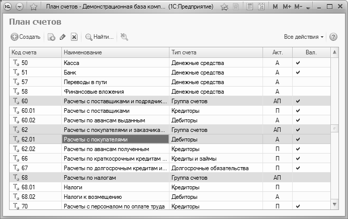 Чтобы перейти к работе с планом счетов, нужно в панели навигации раздела Финансы щелкнуть на ссылке План счетов. В результате откроется окно, изображенное на рис. 2.2.