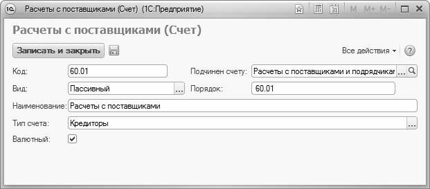 Чтобы добавить в план счетов новый счет, нужно выполнить команду Все действия → Создать либо нажать клавишу <Insert>. Можно ввести новый счет путем копирования уже имеющегося – для этого предназначена команда Все действия → Скопировать, вызываемая также нажатием клавиши <F9> (этот механизм удобно использовать, например, при вводе субсчетов к счету). Для перехода в режим редактирования счета нужно выделить его в списке щелчком мыши и выполнить команду Все действия → Изменить либо нажать клавишу <F2>. При выполнении любого из перечисленных действий на экране отображается окно ввода и редактирования счета, которое представлено на рис. 2.3.