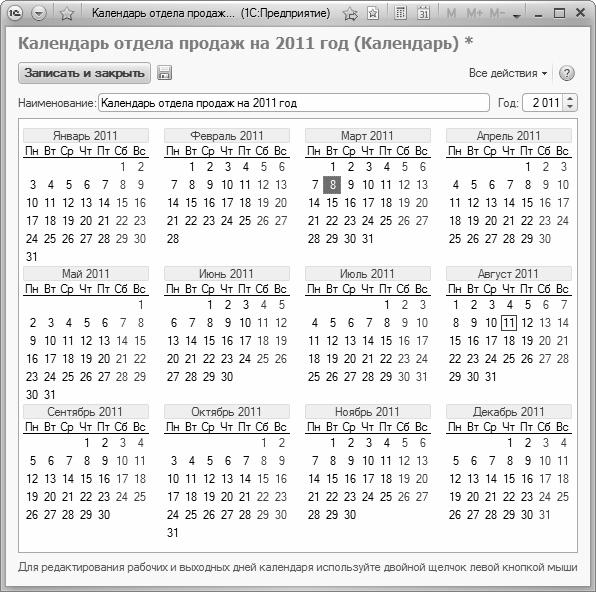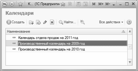 Редактирование сформированного ранее календаря производится в таком же окне. Для перехода в режим редактирования нужно в окне списка дважды щелкнуть мышью на нужном календаре или воспользоваться командой Все действия → Изменить.