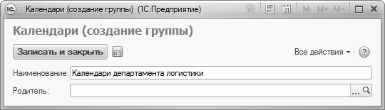 В данном окне в поле Наименование нужно с клавиатуры ввести произвольное название группы календарей (например, Календари департамента логистики). Если эта группа должна входить в состав другой группы из числа созданных ранее, выберите ее из раскрывающегося списка в поле Родитель. В противном случае оставьте данное поле незаполненным. Чтобы сохранить введенные данные, нажмите кнопку Записать и закрыть или комбинацию клавиш <Ctrl>+<Enter>.
