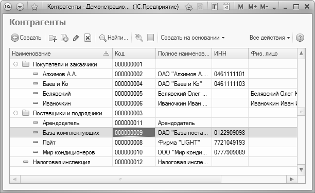 В справочнике реализована возможность группировки контрагентов – довольно удобный механизм, позволяющий разделить их по категориям (например, Поставщики, Покупатели, Заказчики, Подрядчики, Прочие и т. д.). Если вы хотите использовать группировку, то при заполнении справочника рекомендуется вначале сформировать список групп, а затем заполнять группы позициями (партнерами и контрагентами).