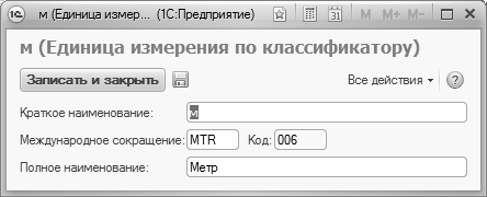 В соответствующих полях данного окна с клавиатуры вводится краткое и полное наименование единицы измерения, а также ее уникальный числовой код и международное сокращение. Рекомендуется вводить значения в соответствии с Общероссийским классификатором единиц измерения – это позволит избежать двусмысленности, некорректности ввода данных и прочих ошибок. Завершается процесс ввода либо редактирования единицы измерения нажатием кнопки Записать и закрыть.