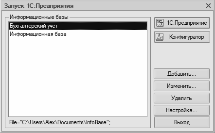 В центральной части окна запуска программы представлен список информационных баз. При первом запуске программы в данном списке может присутствовать информационная база с демонстрационной конфигурацией; эта база входит в комплект поставки и предназначена для предварительного знакомства с системой. Выбор информационной базы осуществляется щелчком мыши на соответствующей позиции списка. Вы можете добавлять в список новые либо редактировать и удалять имеющиеся информационные базы (о том, как это делать, будет рассказано позже).