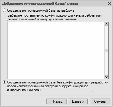 При выборе второго варианта (нижнее положение переключателя) будет создана информационная база без конфигурации. К ней можно будет впоследствии подключить требуемую конфигурацию из соответствующего файла (порядок подключения конфигурации "Бухгалтерский учет" мы рассмотрим позже).