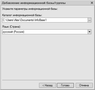 Завершается процесс создания информационной базы нажатием в данном окне кнопки Готово.