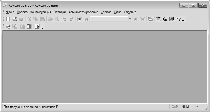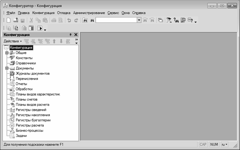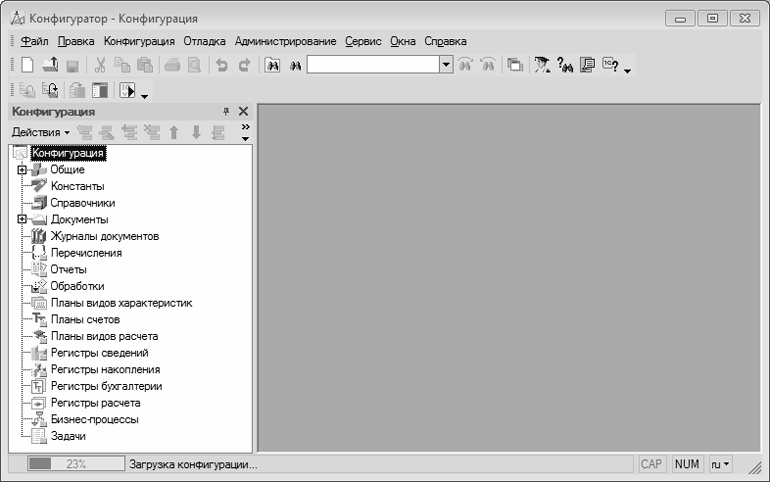 Первое, что нужно сделать в данном режиме – это выполнить команду главного меню Конфигурация | Открыть конфигурацию. В результате в левой части интерфейса откроется окно Конфигурация (рис. 1.7).