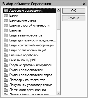 Выбор объектов для дальнейшей работы осуществляется в интерфейсах выбора или списка. Например, для перехода в режим работы с каким-либо справочником необходимо выбрать его в окне выбора (рис. 1.13), которое вызывается на экран с помощью команды главного меню Операции | Справочники.