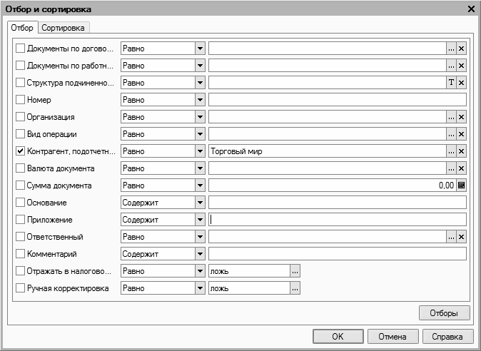 На вкладке Отбор осуществляется настройка параметров фильтра. В левой части вкладки содержится перечень условий фильтра (Номер, Организация, Вид операции и др.). Для выбора требуемого условия необходимо установить соответствующий флажок. Справа указывается конкретное значение выбранного фильтра (либо вводится с клавиатуры, либо устанавливается с помощью кнопки выбора)