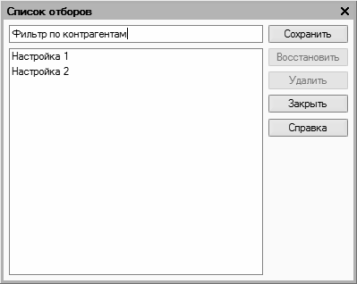 В дальнейшем для применения сохраненного фильтра следует открыть окно Отборы, установить курсор в соответствующую позицию и нажать кнопку Восстановить. В результате в окне Отбор и сортировка на вкладке Отбор будут восстановлены все параметры выбранного фильтра.
