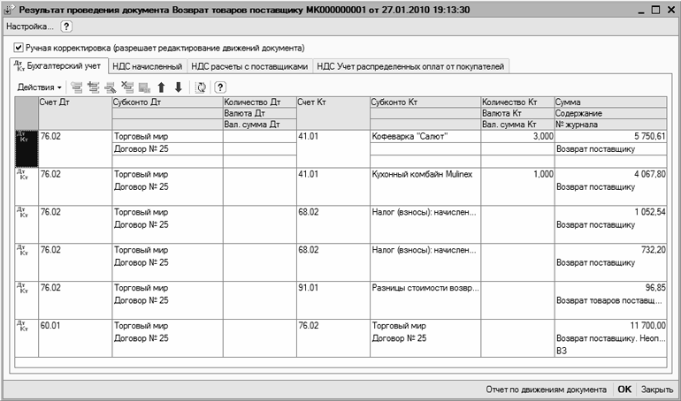 Рис. 6.19. Результат проведения документа на возврат ТМЦ