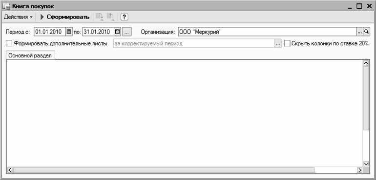 В поле Период с по нужно указать интервал времени, за который формируется книга покупок. Отметим, что в соответствии с действующим законодательством книгу покупок необходимо формировать за каждый налоговый период (напомним, что налоговый период для налога на добавленную стоимость определяется в учетной политике предприятия по налоговому учету), однако при желании вы можете сформировать книгу покупок за любой произвольный период.