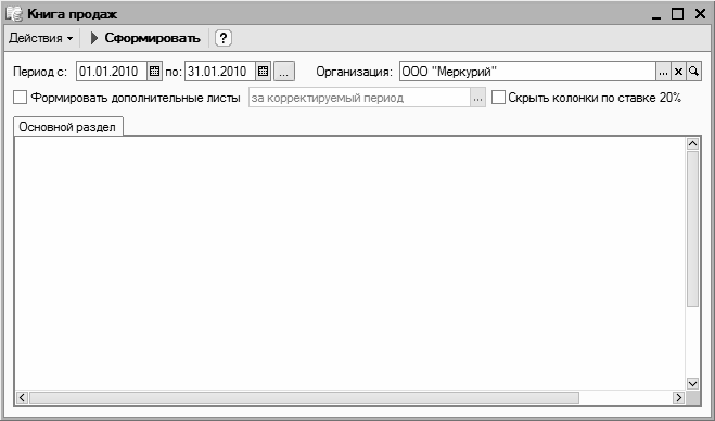 Чтобы сформировать книгу продаж, нужно вначале выполнить настройку параметров формирования отчета. В полях Период с по нужно указать интервал времени, за который формируется книга продаж. В соответствии с действующим законодательством книгу продаж необходимо формировать за каждый налоговый период (напомним, что налоговый период для налога на добавленную стоимость определяется в учетной политике предприятия по налоговому учету), однако при желании вы можете сформировать ее за любой произвольный период.