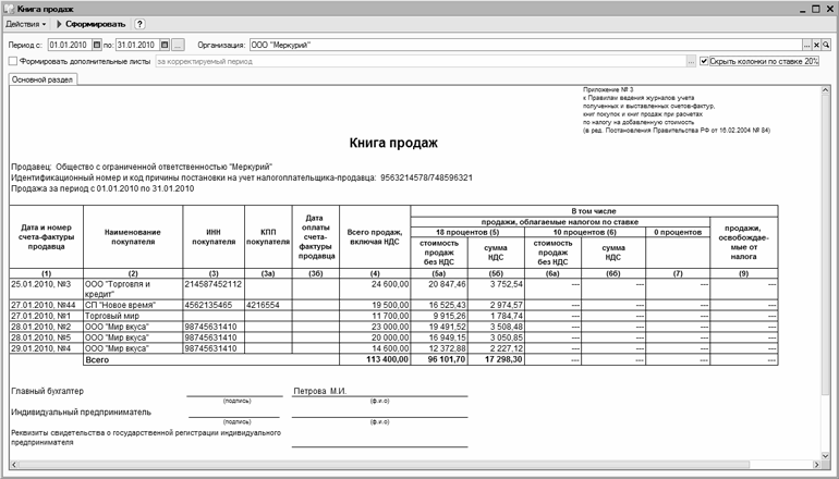 Процесс формирования книги продаж в соответствии с установленными параметрами запускается нажатием кнопки Сформировать, расположенной в инструментальной панели данного окна. Пример сформированной книги продаж показан на рис. 7.17.