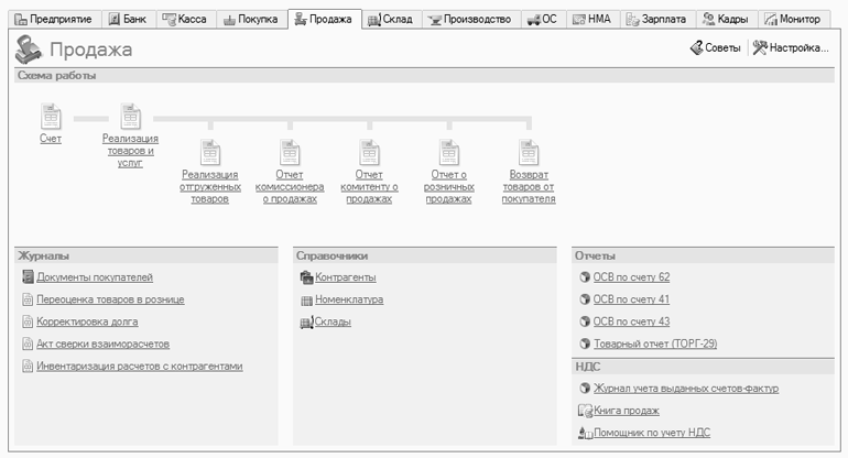 Для быстрого формирования отчетности по расходным операциям и учету НДС используйте соответствующие ссылки, расположенные в панели функций на вкладке Продажа (рис. 7.18).