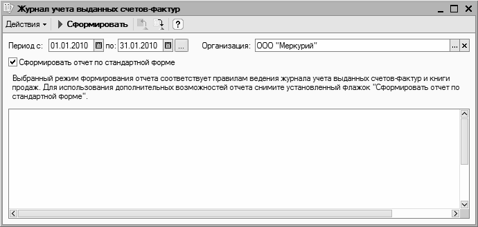 Также важный отчет можно сформировать с помощью ссылки Журнал учета выданных счетов-фактур (см. рис. 7.18). При щелчке мышью на этой ссылке отображается окно, которое показано на рис. 7.20.