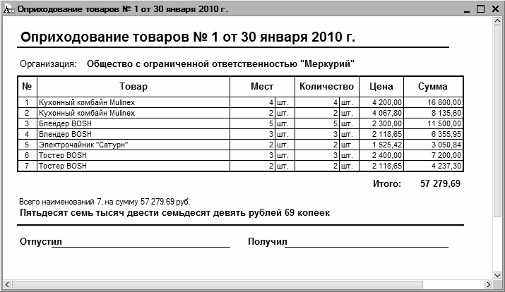 Рис. 8.3. Печатная форма документа «Оприходование товаров»