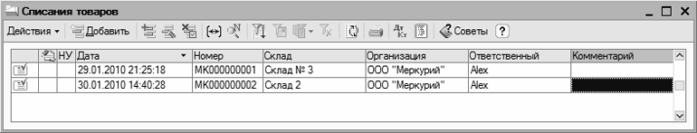 Рис. 8.4. Список документов на списание товаров