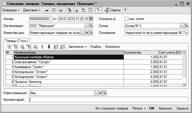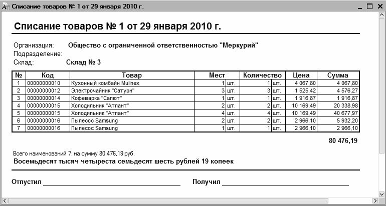 Печатная форма документа (формируется при нажатии кнопки Акт списания товаров) показана на рис. 8.6.